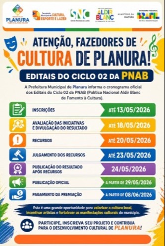 A Prefeitura de Planura informa que estão abertas, até o dia 13/05/2026, as inscrições para os editais do Ciclo 02 da Política Nacional Aldir Blanc de Cultura (PNAB).